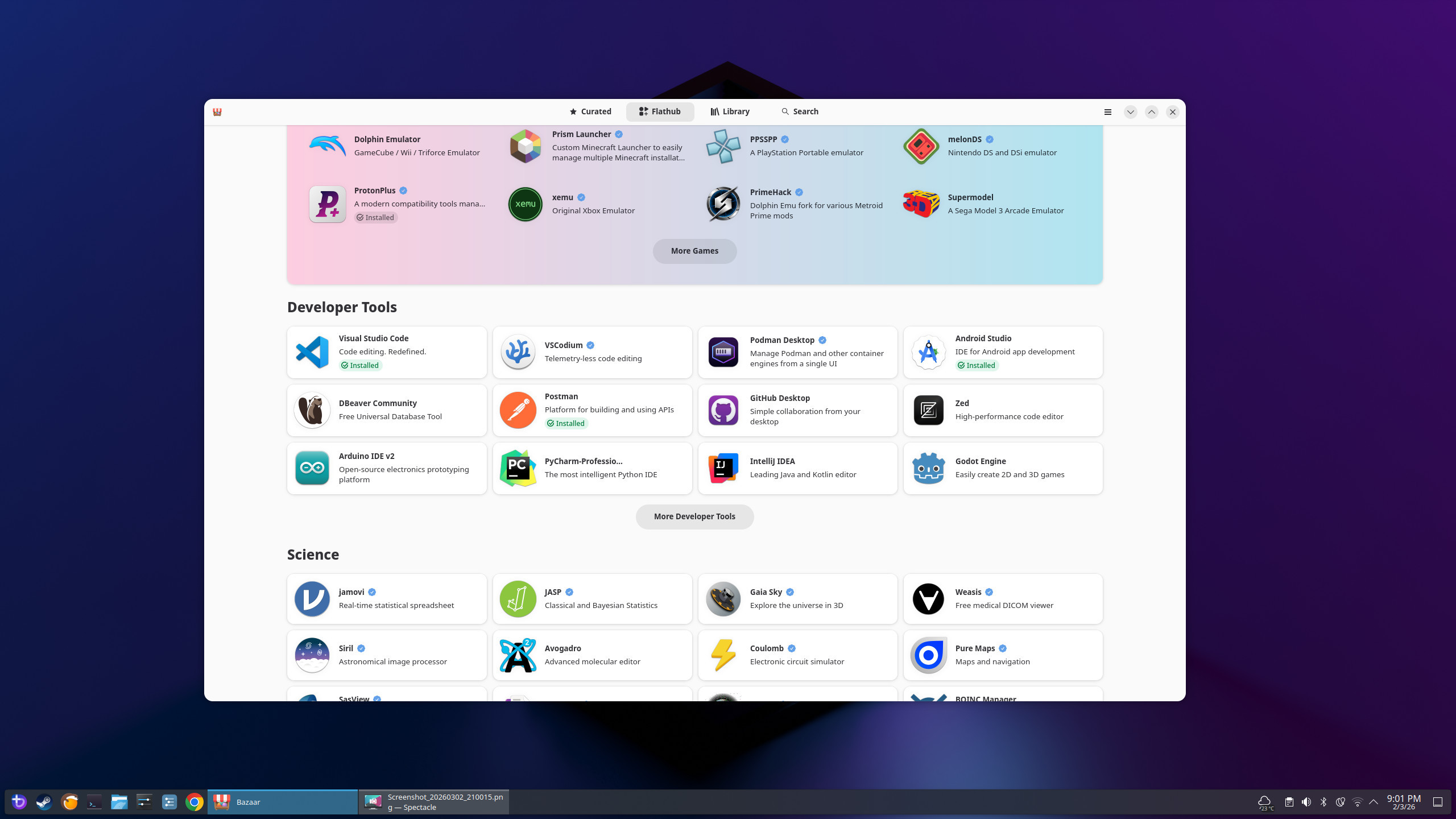 Straight out of the gate, everything worked like a dream. From the Bazaar software store I was able to install Chrome, VS Code, Dropbox, Proton VPN, Postman, and plenty of other goodies. Things that aren’t on Bazaar I can often find as AppImages, such as Cursor, Elegoo Slicer, and WorkFlowy (one of my favourite apps of all time—I’ll probably write a post about it at some point).